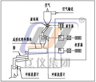 本儀表由(一次表)粉體沖量式流量變送器;(二次表)粉體沖量式流量儀;穩流裝置(一般情況下,由生產廠指導用戶設計、制造)三部分組成(需流量調解時應配流量調節器),系統配套見下圖