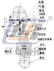 流量計是按節流元件,分流原理設計制造的;被測蒸汽進入流量計主體后分為兩路,一路Q1通過節流孔板(此部分蒸汽不作計量),在孔板兩側產生壓差△P,在此壓差作用下,另一路Q2流經噴嘴噴射在葉輪上,葉輪軸轉動。為減慢葉輪軸轉速,葉輪軸下方按有阻尼葉片并浸沒在阻尼室內水中。由于兩路有同一壓差△P,在規定流量范圍內,根據流體相似原理,兩路蒸汽流量Q1和Q2之間的比例關系基本為常量,這樣只要測出流經噴嘴部分的流量Q2,即可知總流量Q。